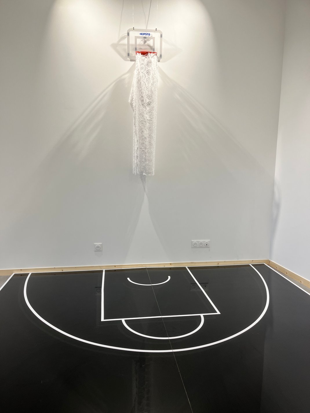 Dentelle propose une tentative de fixation du temps, une confrontation de deux espaces temps : la délicatesse et le temps de confection pour la réalisation d’un filet sportif transposé dans un univers du mouvement et de l’effort.